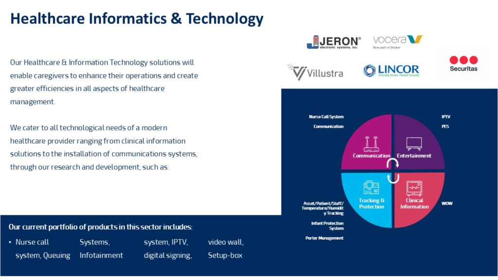 Our Healthcare & Information Technology solutions will enable caregivers to enhance their operations and create greater efficiencies in all aspects of healthcare management. We cater to all technological needs of a modern healthcare provider ranging from clinical information solutions to the installation of communications systems, through our competent Engineering Department.